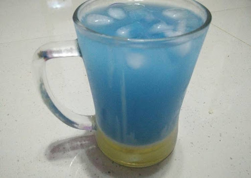 - Tuang sari bunga telang ke dalam gelas, tambahkan es batu dan air secukupnya.
